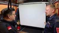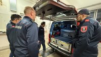Es wurde erklärt, wie das MTF je nach Einsatzanforderung umgebaut werden kann, etwa durch das Umlegen der Sitze oder den Ausbau des Kofferraumeinbaus mit Schubladensystem, um zusätzlichen Stauraum zu schaffen. Zudem wurden die variablen Befestigungsmöglichkeiten für einen sicheren Transport von Gerätschaften, wie beispielsweise AS-Flaschen, vorgestellt. Weitere Ausstattungsmerkmale wie der ausklappbare Tisch, die vorhandene Wechselstromversorgung wurden vorgestellt.