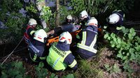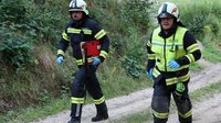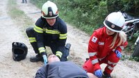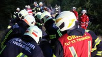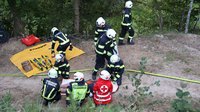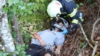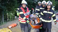 Ein Mopedfahrer wurde aus einem abschüssigen und unwegsamen Waldstück mit schwieriger Zugänglichkeit mithilfe einer Schaufeltrage gerettet, der Zweite wurde verletzt auf dem Güterweg vorgefunden und mit einem Rettungstuch aus dem Gefahrenbereich gebracht.